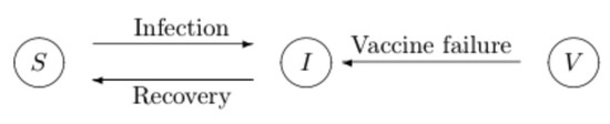 The stochastic SIVS model, used to represent the evolution of a contagious disease within a population, was described in [27]. It refers to a compartmental model where individuals are classified in three groups: namely, susceptible (S), vaccinated (V), and infected (I). The model describes the movement of individuals from one compartment to another as it is shown in Figure 1.
