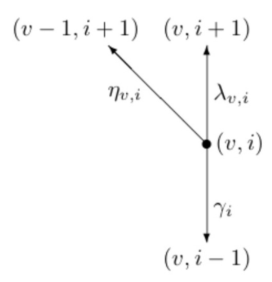 In more detail, transitions out of a specific general state are depicted in Figure 2, where the appearing rates are introduced in order to ease the notation in the sequel. More explicitly, we define transition rates as follows