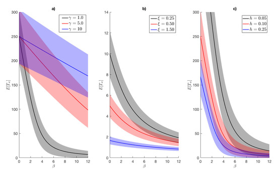 and as a function of when , , . Curves in (a) correspond to , and . In (b), and are represented for , and . In (c), mean and standard deviation are represented for , and .