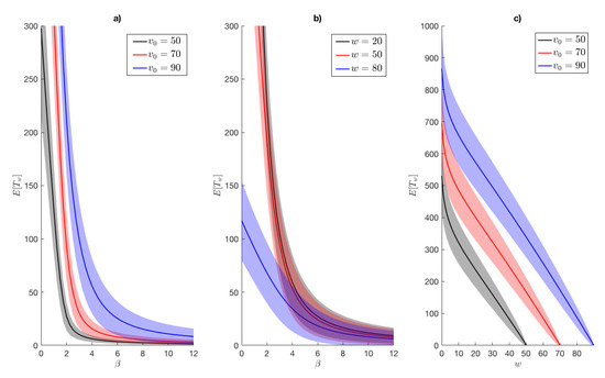Figure 4a presents and as a function of for three values of the initial coverage, that is, , and 90 individuals. The warning level is fixed as . All curves present a decreasing shape as a function of . However, for a fixed internal transmission rate we observe that the expected length of the sleeping period increases with the initial coverage. In Figure 4b we assume an initial vaccine coverage of 90 individuals and represent mean and standard deviation of as a function of , for several warning levels, namely and 80. As could be expected, under the same internal transmission, higher warning levels give shorter sleeping times. Finally in Figure 4c, the expected and standard deviation are represented as functions of the warning level, the internal contact rate is and we consider an initial number of vaccinated individuals and 90. Notice that the warning levels are bounded by , that is . According to the intuition, expected values and standard deviation decrease for increasing warning levels. When we fix an allowable warning level we observe the same behavior on described for Figure 4a.