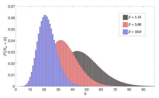 In Figure 5, the distribution of the number of infections of susceptible individuals, taking place during the sleeping time, is plotted for different values of and 10.0. We can observe that for increasing rates of the internal transmission rate, the distribution of is displaced to the right.