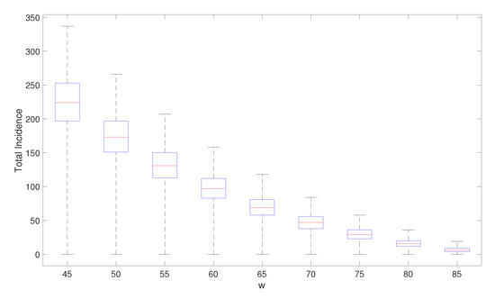 To have a better understanding of the distribution of the total number of infections during the sleeping time, we represent in Figure 6 a boxplot graph of the random variable . We assume that the initial number of vaccine protected is and the outbreak starts with a single infected individual, . Our purpose is to compare patterns of the epidemic, when we modify the warning level. The whiskers start at the lowest value of infectious cases, that is , and extend to the 99th percentile. We observe that the dispersion of the total incidence, measured in terms of the inter-quartile range, decreases as a function of the warning level and the distribution changes from left-skewed to right-skewed as w increases. As expected, the epidemic process involves more individuals when warning is kept at low levels. Numerical experiments not reported in the paper, when the warning level is , indicate that there is a 0.99 probability that the number of infections until the complete loss of vaccine protection fluctuates in the interval , with median at 3500 cases.