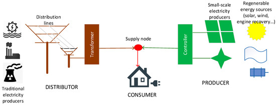 Figure 1 represents a consumer–producer–distributor structure from the point of view of the electricity circuit.