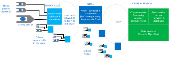Then, the monitoring platform pilot was used to implement and test the algorithm in a real environment. This was composed of sensors connected to a collector used to monitor a branch from a power supply network (sensor cells), a node transceiver used to collect data from sensor cells, packing and transmission, and a central station, which ran a server component based on a complex event processing module connected to the data analyzer engine, which implemented the consumer planning algorithm; see Figure 2.