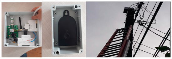 The monitoring platform was built to operate under outdoor conditions (mounted in IP67 casings). For the two case studies presented, the pilot platform was deployed with seven sensory cells (mono and three-phase) and seven collectors—the system collected data from seven consumers and associations of consumers. It was installed in three localities and operated (and still operates) both in the warm season and in winter, at the latitude of Romania. Figure 3 shows images during the system deployment and the system integration in the IP67 box casings.