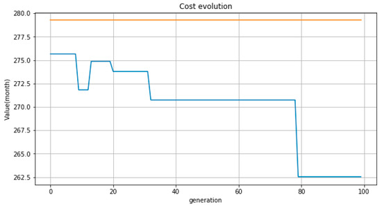 The results were initially tested with a larger population (50–100 individuals) but we reduced the population and observed very good results up to a number of 10 individuals/generation; successive tests were performed to reach this number of individuals per generation. Interestingly, under 10 individuals per generation, the convergence time greatly increased. Thus, it appears that 10 individuals/generation is optimal for this kind of problem, in which the number of devices for a consumer is up to 10. All simulations with producer–consumer configurations generated showed a decrease in cost in the first 500–600 generations, then a cost maintenance from generation 600 onwards. Thus, 800 generations were chosen as the fixed number of generations imposed. For each manufacturer–consumer configuration, the algorithm ran for 800 generations and the minimum cost solution obtained after the 800th generation was considered the optimal solution.