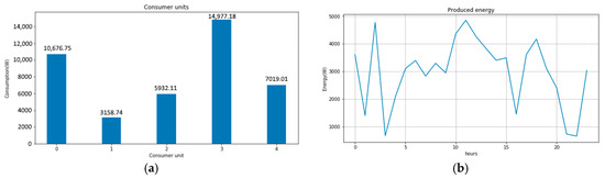 Consumers have typical household appliances: TV, fridge, lighting, PC, microwave oven, air conditioning, electric oven, vacuum cleaner, washing machine, and a water pump with hydrophore. The distribution of consumption per consumer units, distribution of the energy produced (from photovoltaic panels), and an unplanned distribution in which a maximum of consumption is concentrated during the morning and evening can be observed in Figure 11. In addition, in the figure, at the bottom, it is shown how the electricity consumption is distributed for a solution generated by the genetic algorithm. One can observe the preservation of a similar pattern to the unplanned use—this is because of the consumption units that do not allow for re-planning (for example TV, PC, illuminator), but is also due to a distribution of consumption during the day when the production of electricity through photovoltaic panels is at maximum level. The main re-planned unit of consumption is the hydrophore pump. Thus, in the unplanned solution, the pump comes into operation every morning. A basin with a 200-L volume is filled, which is sufficient for the daily needs of the household. In contrast, the water filling of the basin was re-planned by the intelligent algorithm starting at 1 pm, at the peak of electricity production from the photovoltaic panels. Although the solution may be intuitive, the fact that it was found by the intelligent algorithm shows its feasibility. Another producer–consumer assembly may have less obvious solutions, as shown in the following case study.