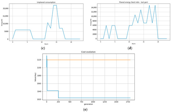 Figure 11 represents the consumer–producer characteristics for case study number 1 (domestic consumer). The top left of the figure shows the consumption of the 10 devices (household appliances), the top right shows the energy produced by the photovoltaic panels, the middle left shows the total consumption without any planning, and the middle right shows the consumption with planning. It can be seen that consumption somewhat follows the pattern of the producer of energy from renewable sources, which leads to a reduction in cost. The pulse at 8 pm is due to the impossibility of planning some devices that are used at that time. The bottom of the graph represents the evolution of the cost from the initial cost, for the unplanned solution, to the final cost obtained by the algorithm with the planned solution, for which consumption is illustrated in the figure in the middle right.