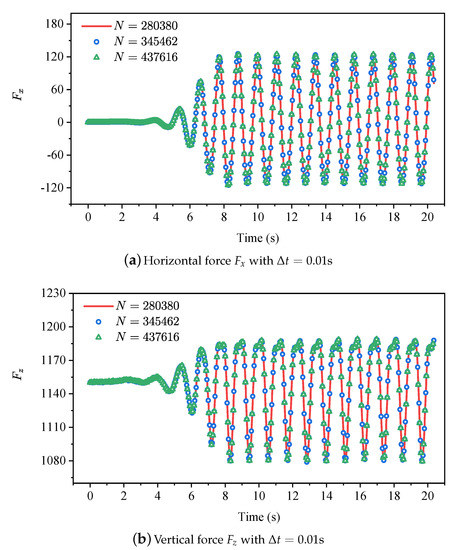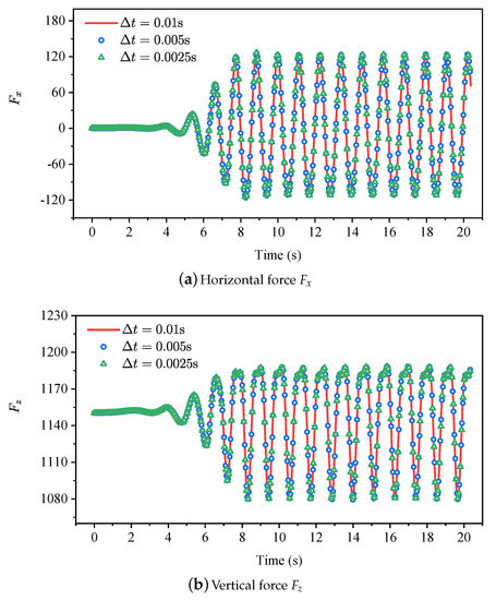 Evolutionary profiles of the hydrodynamic loads , , and using three different time increments with .