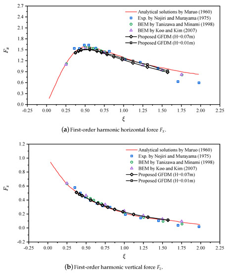 Numerical comparisons of the first-order harmonic components of the hydrodynamic loads acting on the body surface. is normalized by , by , and by with , , and (or ).