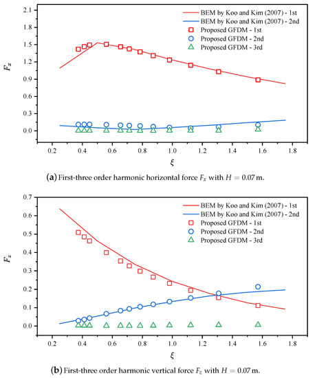 In general, the numerical method proposed in the present study has enough accuracy in the prediction of the first-order harmonic component for a problem regarding the wave-structure interaction. In addition, it can also be observed that the wave steepness has little effect on the results of the dimensionless hydrodynamic loads with various , which means that the hydrodynamic loads are linearly and positively correlated with the wave height. Koo et al. [33] also analyzed and discussed the higher harmonic hydrodynamic loads acting on the surface-piercing body. They found that the first-order harmonic component is lager as compared with the second-order and three-order components, and the second-order vertical force may greatly exceed the first-order component at high . Figure 8a,c show the first-three harmonic hydrodynamic loads acting on the body surface. The first-order harmonic component contributes most of the hydrodynamic loads, while the second-order harmonic component may exceed the first-order at low . The third-order harmonic component has a minimal effect on the hydrodynamic loads. It is seen that the proposed meshless scheme also shows good performance in the prediction of high-order hydrodynamic loads as compared with the BEM results [33].