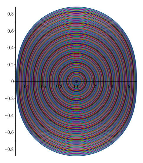Furthermore, for we get the family defined by Sokół and Stankiewicz [], including functions f such that lies in the region bounded by the right half of the lemniscate of Bernoulli given by . Sokół [] generalized this class by introducing a more general class . Moreover, the properties of the class such that the quantity lies in an eight-shaped area in the right-half plane were studied by Cho et al. []. Raina and Sokół [] studied the family , where