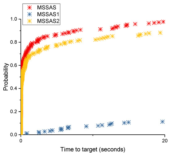 The time-to-target plot [42] was used to compare MSSAS with MSSAS1 and MSSAS2 on four instances and their respective targets. To get the time-to-target plots, we performed 200 independent runs of MSSAS, MSSAS1 and MSSAS2 on these four instances. Figure 2 and Figure 3 illustrate the efficiency contribution of our two proposed components. Figure 2 shows that the probabilities of obtaining a solution of the target value by MSSAS are approximately 10% and 30% in at most 0.22 and 0.89 s, respectively, whereas the probabilities of obtaining a solution of the target value are approximately 10% and 30% in almost 32.46 and 98.28 s by MSSAS1, as well as at least 0.35 and 1.04 s by MSSAS2, which are considerably more than MSSAS.