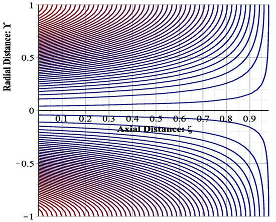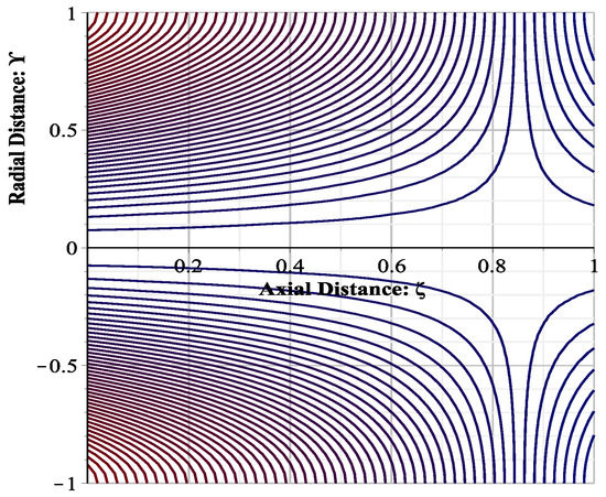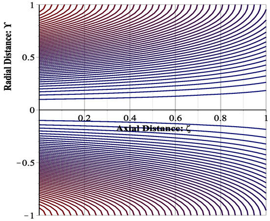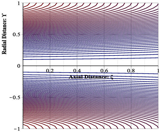 At this point it is worth mentioning that this expression of volume flow rate is independent of non-Newtonian parameters and . In fact, if it is compared with the Newtonian case under same conditions [1,16], the same expression is obtained, which is surprising. Note that for no reverse flow at , this implies that the parameters , and should satisfy the following inequality if reverse flow is avoided near the exit of the tube.