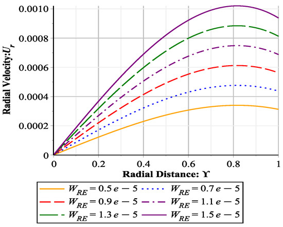 Expression of radial velocity (121) is independent of and it attains maximum somewhere within the tube as shown in Figure 12. Using Newton Raphson method it is found that is maximum at and this critical point is independent of the wall Reynolds number . However in Figure 12 the radial velocity profile can be seen to have a direct relationship with wall Reynolds number.