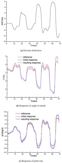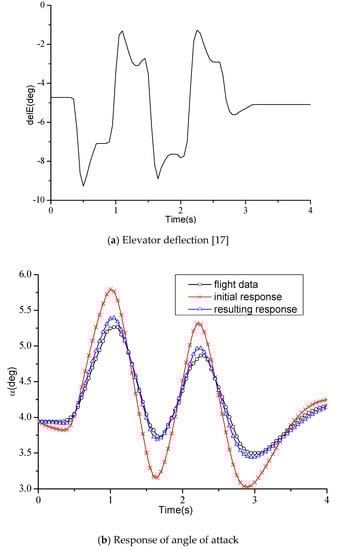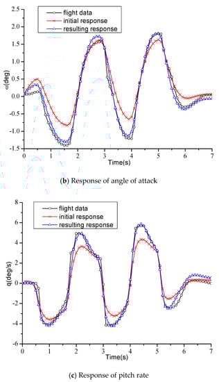 It could be observed from Figure 3 that the initial responses of angle of attack and pitch rate have some discrepancies as compared with the reference response curve. However, when the system parameters are alternated with the identification result , the resulting response curves are almost coincident with the reference curves.