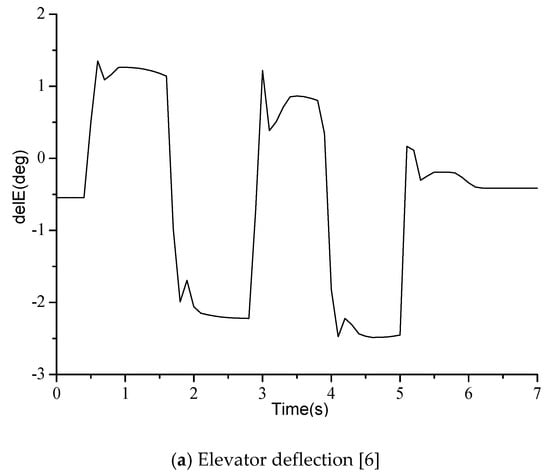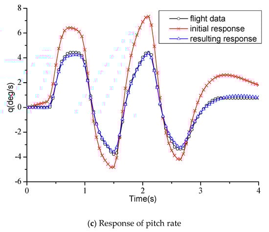 The initial flight conditions of “all iced” aircraft are shown in Table 7. This initial flight conditions are quite close to the conditions of clean aircraft, which will help to get a better identification result. The output responses fitting curves are shown in Figure 8, and the identification results are shown in Table 8, respectively.