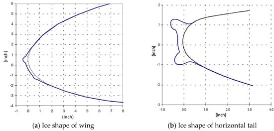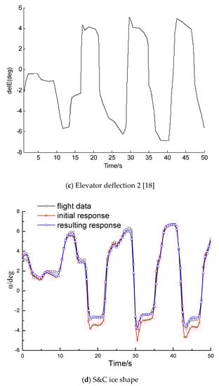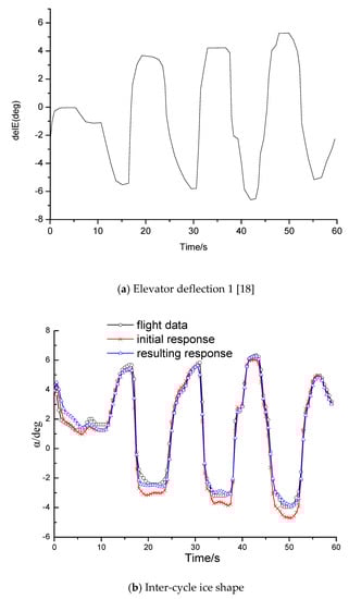Identification of all configuration iced aircraft is studied in this section. With the aerodynamic parameters of clean aircraft in Section 4.1 as the initial values and the flight test operation (Elevator Doublet) in [] as the input values, the aerodynamic parameters of “all iced” aircraft are identified. These flight tests were conducted with the whole iced configuration of Twin Otter’s aircraft, including the wing, horizontal tail, and vertical tail. The ice shapes of those plans could be found from [] as shown in Figure 7.