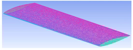 The aerodynamic parameters of the wing and horizontal tail: , , are calculated under both clean and iced conditions with the ice shapes of the wings and horizontal tail chosen from [] by the individual component CFD method. As an illustration, Figure 9 shows the grid for CFD calculation of the horizontal tail. The calculation conditions are based on the icing flight test conditions: flight speed = 55 m/s, flight altitude H = 1200 m.