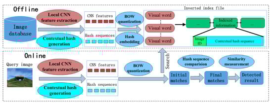 (2) The contextual hash embedding. To improve the discriminability of the quantized features, we also generate a contextual hash sequence for each feature and embed it into the inverted index file. Since the proposed contextual hash sequence is composed of a small number of hash values, it is quite compact and thus does not need too much additional storage space. Moreover, different from the CNN features that usually describe the complex patterns and semantic information of images, the hash sequence captures the correlations between blocks divided from relatively large regions surrounding the local CNN features, which can sufficiently characterize the contextual information of these features and thus improve the features’ discriminability significantly. That will lead to a higher detection accuracy.