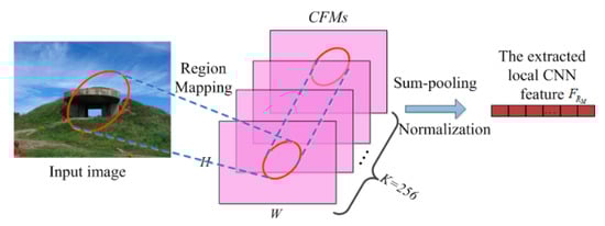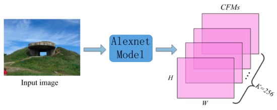 From [], by feeding an image into the AlexNet model, the output of the fifth convolutional layer is feature maps with the size of , where and and are proportional to the width and height of the image, respectively. Denote the feature maps as . These CFMs will be further used for local CNN feature extraction. Figure 3 illustrates the generation of CFMs.