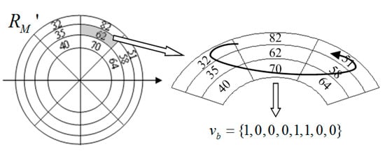 For a given expended region , we first divide it into blocks with equal size in the log-polar space and then compute the average gray intensities of these blocks. We denote the average gray intensity of block in the expended region as , and those of the eight adjacent blocks of block as , where . Note that some adjacent blocks of an edge block do not exist, and thus their average gray intensities are set as 0. Then, the hash values of block denoted by can be generated by Equation (3). Figure 5 shows an example of the extraction of feature values from a block.