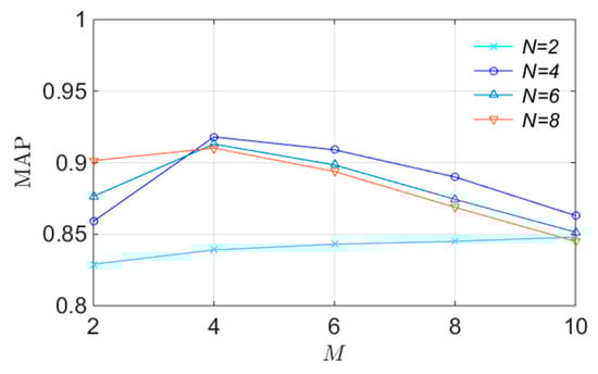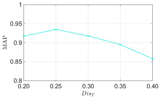 Then, we test the impact of the threshold . Figure 8 shows the effects of on the MAP. From this figure, it can be clearly observed that the detection performance degrades when is too small or too large. The reason is that if is too small, a considerable number of true feature matches will be detected as false ones, and if is too large, many false matches will be determined as true ones. According to this figure, when , we can achieve the highest detection accuracy. Thus, we set in the following experiments.