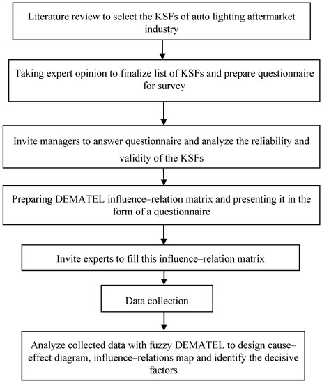 The purpose of this research was to establish the cause and effect relationship among the KSFs of the auto lighting AM industry. To help in structuring the methodology followed, a research flowchart was used as shown in Figure 1. The research flowchart mainly depicts the process structure for analyzing the KSFs and then identifying the decisive factors.