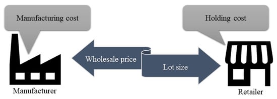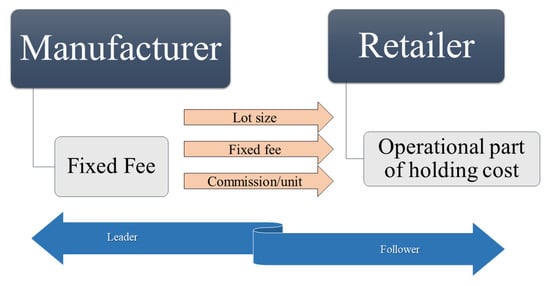 Within the supply chain, the decisions regarding loss minimization and profit maximization are the crucial decisions. Feng and Tan [] discussed coordinating the decisions regarding the pricing policy of the SCM. The scenario about loss aversion was discussed substantially. A discussion about the online and offline SCM was discussed by Lei et al. []. They studied the consumers’ strategies. The game strategy within the SCM comes forward whenever players of the SCM are not equal in power. In game theory, with two players, one is the leader, and the other one is the follower. The leader is the decision maker of the SCM. Chen et al. [] discussed a retailer Stackelberg SC where retailers made all the decisions. Wei and Jing [] studied the Stackelberg game policy within the SCM for backward integration. In this newsvendor model, a Stackelberg game policy is used where the manufacturer is the leader and the retailer is the follower. However, the follower has the priority to choose his/her optimum decisions. A Stackelberg game policy was discussed by Sarkar et al. [] within an integrated inventory model for setup cost reduction.