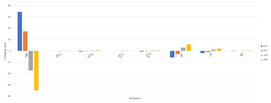 In order to analyze the impact of the change due to key parameters p (retail price), (retailer’s holding cost for consignment policy), (retailer’s shortage cost for consignment policy), (shortage cost of manufacturer under consignment policy), (goodwill loss for manufacturer under consignment policy), k (manufacturing cost), T (fixed cost of RFID implementation), and (cost of one passive RFID tag), on the economic policies, in-depth sensitivity analysis were done numerically. The sensitivity analysis was done by varying to for the individual parameter by keeping all others unchanged. The most sensitive parameter was the retail price p. The positive changes brought more joint profit in the coordination case and vice versa for the negative percentage changes. The least sensitive parameter was the holding cost for manufacturer under the consignment policy , i.e., the changes in the joint total profit were much less for the changing of the parameter . As the unreliability was solved, the holding cost became less sensitive. Figure 3 interprets the sensitivity of the parameters graphically.