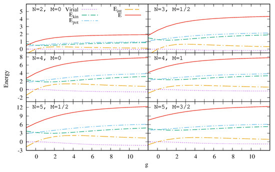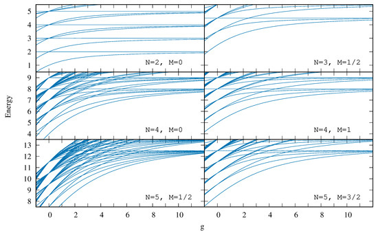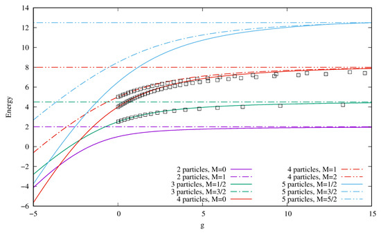 We consider systems with 2 to 5 fermions. These particles have spin 1/2, therefore for N particles we can have possible total spin projections. As the Hamiltonian commutes with the total third spin component, the Hamiltonian is built in boxes with well defined M. Thus, it is possible to treat each total spin projection independently [33]. The simplest case is when all fermions have spin up, then , and the wave function factorizes in an antisymmetric spatial wave function and a symmetric spin wave function for N particles. The antisymmetric spatial wave function is a Slater determinant built with the lowest single-particle states. The antisymmetry of the wave function prevents two particles from being in the same position and the particles in this wave function do not feel the contact interaction. Therefore, its energy is independent of the interaction strength.