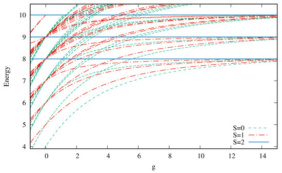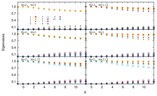 The other trivial cases are the negative M values because due to the spin symmetry of the Hamiltonian, the properties of the states do not depend on the sign of the spin projection. The diagonalization of a Hamiltonian box with a given M would provide the same eigenvalues that the box with total spin projection . Therefore we concentrate in the study of cases with .