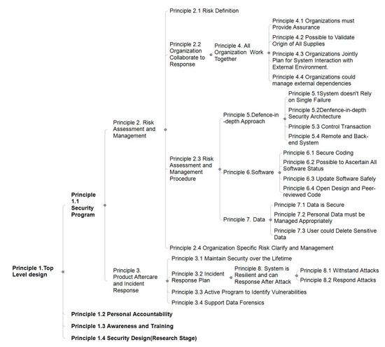 As can be seen from Figure 1, Principle 1 is the most important, as it defines the requirements of top-level design concerning CAV cyber security. In addition to Principles 1.2 and 1.3, which consider human factors, Principle 1.4 (which considers security program design) is an essential step towards comprehensive protection. Principle 1.1, regarding the security program, divides the protection process into three stages:
