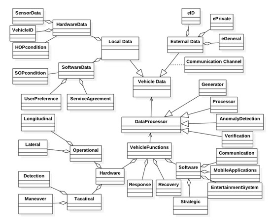 As shown in Figure 2, the proposed UML-based CAV cyber security framework is developed to define the relationships between each component and the structure in the CAV, including hardware, software and their generated data, to help the vehicle to function well. Based on the framework, different types and points of potential CAV cyber-attacks can be analysed and categorized. The main classes in this UML-based CAV framework include Vehicle Data, Data Processor and Vehicle Functions.
