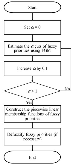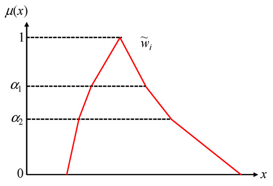 In PLFGM, a fuzzy priority is estimated by connecting some of its α cuts with straight lines, as illustrated in Figure 3, in which the membership function on either side is approximated by connecting four α cuts with straight lines [43]. FGM is a special case of PLFGM because only the α cuts when α = 0 and 1 are connected.