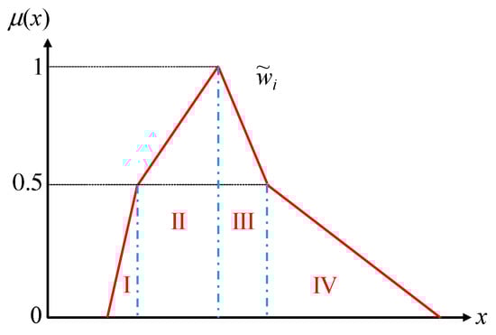 A fuzzy priority estimated using the PLFGM approach can be decomposed into several non-normal TrFNs, as illustrated in Figure 6. In this figure, there are four non-normal TrFNs, whose corner data are summarized in Table 3. Then, the defuzzified value of can be derived by applying Theorems 3 and 4 as follows.