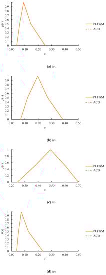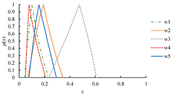 In the PLFGM approach, the α-cuts of fuzzy priorities when α is in {0, 0.5, 1} were estimated according to Equations (33) and (34) and then connected, which resulted in their piecewise-linear membership functions, as shown in Figure 9. Obviously, most of the fuzzy priorities estimated using the PLFGM approach resembled their exact values. Subsequently, COG is applied to defuzzify these fuzzy priorities. The results were 0.121, 0.209, 0.482, 0.11, and 0.174. Three of the estimated priorities were equal to the corresponding exact values, showing the effectiveness of the PLFGM approach.