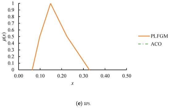 Fuzzy priorities estimated using PLFGM (a) w1; (b) w2; (c) w3; (d) w4; (e) w5.