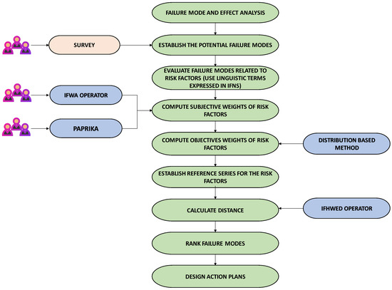Let , ) be an IFN provided by each member of the group to assess each failure mode with respect to each risk factor, and is the subjective weighting of each risk factor given by each member of the decision group. The Intuitionistic Fuzzy Weighted Averaging (IFWA) operator (see Equations (7) and (8)) will be used to aggregate the judgements and derive a consensus judgement stemming from the decision group [35].