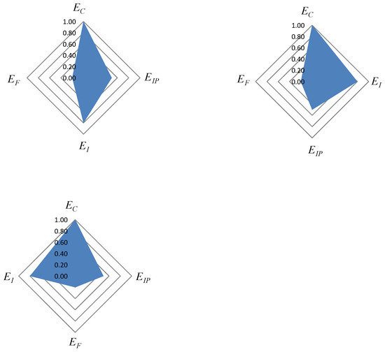In order to introduce a less naive (and nonlinear) overall efficiency indicator, let us start from an interesting geometric representation of the performance scores obtained for the four perspectives in the first stage: a radar chart in which we represent along each of the four semiaxes the score of a different perspective; some examples are shown in Figure 2 and Figure 3. What we obtain is a diamond-shaped polygon; the biggest diamond is related to the case of a museum which is fully efficient with respect to all four of the perspectives, i.e., with (Figure 2), while the diamond “shrinks” asymmetrically when the efficiency score of a perspective decreases (Figure 3).