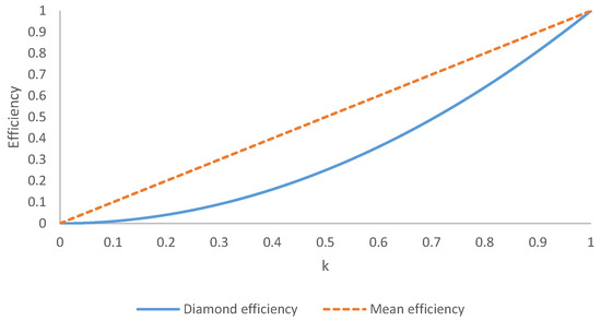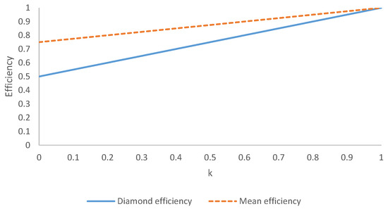 Behavior of the diamond and mean efficiency measures as a function of the perspectives’ efficiency scores when .