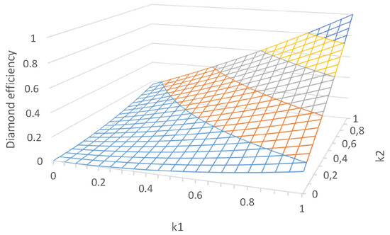 It is straightforward to see that the diamond efficiency measure is not linear, but, on the contrary, if the efficiency scores of all perspectives are multiplied by the same factor k, then the diamond efficiency score is multiplied by a square factor .
