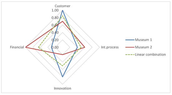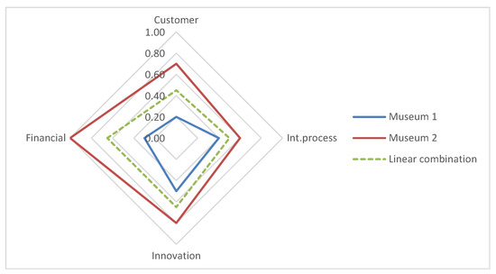 Radar chart showing a representative diamond of the BSC perspective scores for the museums of Example 1.