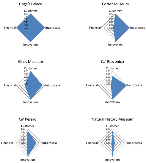 Figure 9 illustrates the DEA-BSC efficiency scores obtained for the various museums in the first stage using a radar chart in which the scores of the different perspectives are displayed along the semiaxes. We may observe that the situation is fairly diversified, even among the museums declared as efficient by the second stage DEA model.