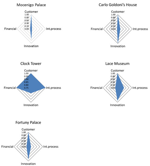 Indeed, only the Doge’s Palace is fully efficient with respect to all four of the perspectives: therefore, this is the only museum that gets the maximum value for the area of the diamond defined by the perspective scores , , , , and exhibits a diamond efficiency score D equal to 1 (see the last column of Table 11). The Clock Tower, Glass Museum, and Correr Museum display a diamond efficiency score greater than while, on the contrary, the Mocenigo Palace exhibits the lowest score with respect to the diamond efficiency despite being efficient according to the DEA model.