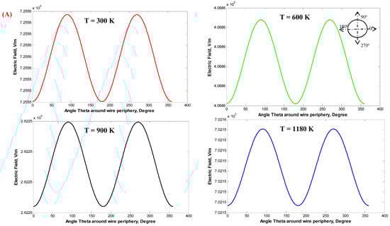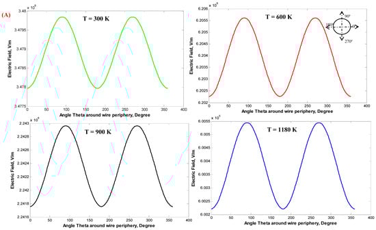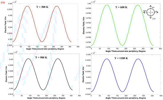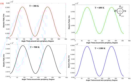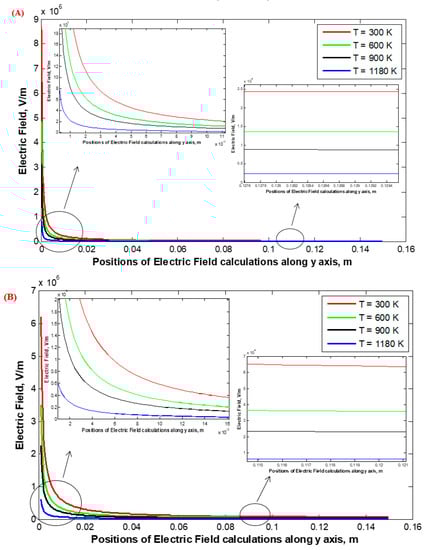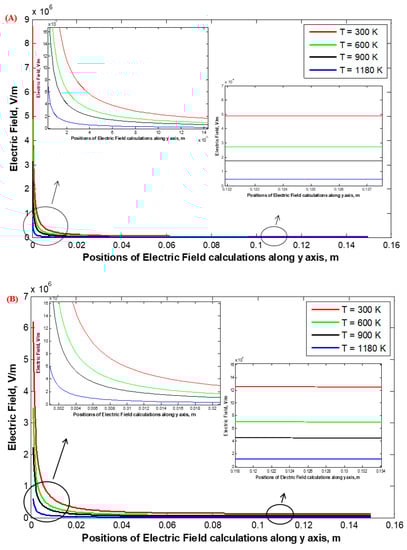 Figure 14 shows the distribution of the electrostatic field around the stressed discharge wire for single-wire WDESP with the wire radius rc of 0.26 and 1.975 mm and the corona onset voltage Vo of 14.939 and 30.868 kV, respectively. It is clear that with increasing the temperatures of the incoming gases from 300 to 1180 K, the electrostatic field around the discharge wires is decreased due to the increase in the ion mobility of the gases. Additionally, with the increase in the wire radius, the electrostatic field around the stressed wires is decreased, and this is in agreement with previous works.