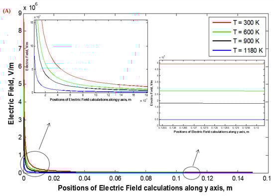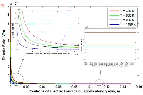 The distributions of the electrostatic field surrounding the central-discharge wire of the WDESP configuration (1, 3, 5, and 7 discharge wires; rc = 0.26, 0.935, and 1.975 mm) with high-temperature incoming gases (300, 600, 900, and 1180 K) at the corona-onset voltage are shown in Figure 14, Figure 15, Figure 16 and Figure 17. The electrostatic field surrounding the central wire of all the WDESP configurations is higher at a lower temperature (300 K) and decreases with increasing temperatures (300 k through to 1180 K). This is because of the increase in the energy of ionic particles, so the corona-onset voltage occurs at lower voltage levels with an increasing WDESP temperature. Additionally, with the increase in the radius of the stressed wires, the electrostatic field surrounding the central wire of WDESP at the same temperature is decreased (Figure 14, Figure 15, Figure 16 and Figure 17). In case of increasing the number of discharge wires of WDESP (3, 5, 7 wire) at the same WDESP temperature and same wire radius, the electric field is decreased because the effect of shielding, which occurs on the central wires due to the other stressed discharge wires of WDESP (Figure 14, Figure 15, Figure 16 and Figure 17). Figure 18, Figure 19, Figure 20 and Figure 21 show the electric field in the Y-axis of WDESP, which starts from the discharge-wire surface to the collecting plate at high temperatures of 300, 600, 900, and 1180 K. The electric field close to the stressed wires and the collecting plates are higher at lower temperatures than the cases of high-temperature WDESP (Figure 18, Figure 19, Figure 20 and Figure 21).