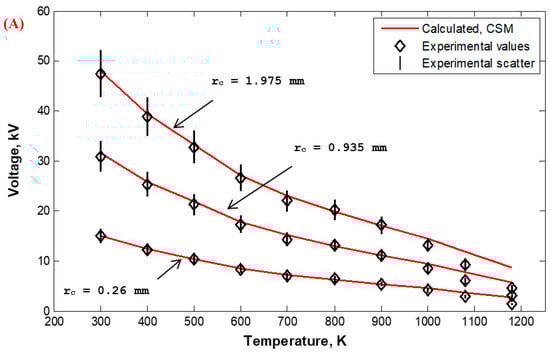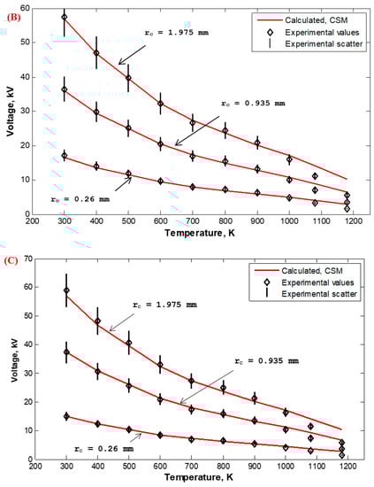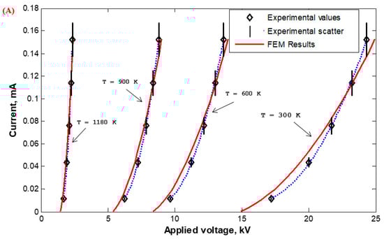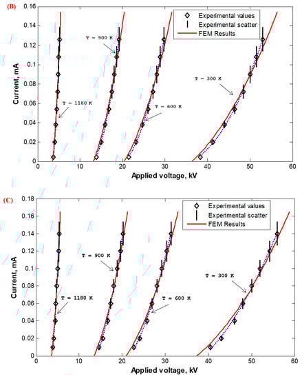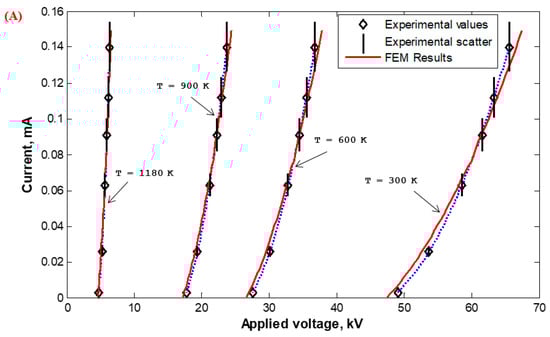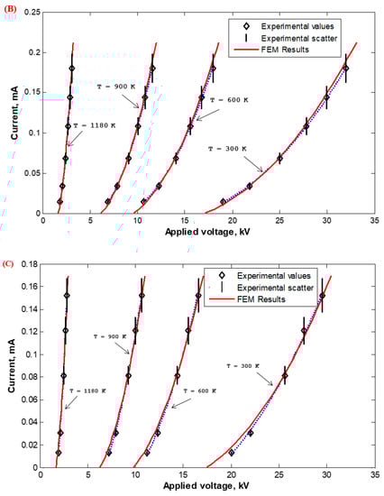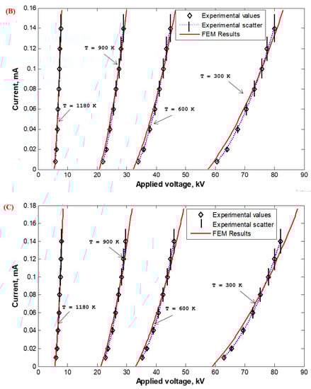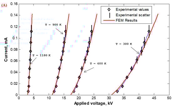 Corona I–V properties were experimentally measured in the Laboratory of High Voltage Engineering of Czech Technical University (CTU) in Prague, Czech Republic, and calculated based on the FEM for wire-duct precipitators with different numbers of discharge wires (1, 3, 5, and 7) with varying wire radii (0.26 (Figure 23), 0935 (Figure 24), and 1.975 mm (Figure 25)) with high-temperature incoming gases from 300 to 1180 K. The wire-to-wire spacing was kept constant at 14.5 cm and the plate-to-plate spacing (2H) was also kept constant at 30 cm. It is satisfying that the characteristics calculated by FEM agreed reasonably—within the experimental scatter—with those measured experimentally, as shown in Figure 23, Figure 24 and Figure 25. The reduction in the corona-onset voltage with increasingly high temperatures (from 300 to 1180 K) is due to the corresponding field improvement at the wire surface due to an increase in the ionization coefficient at high temperatures. The corona current depends on how high the applied voltage is above the onset value. This is why the corona current at the same applied voltage increases with the increase in the incoming gas temperature.