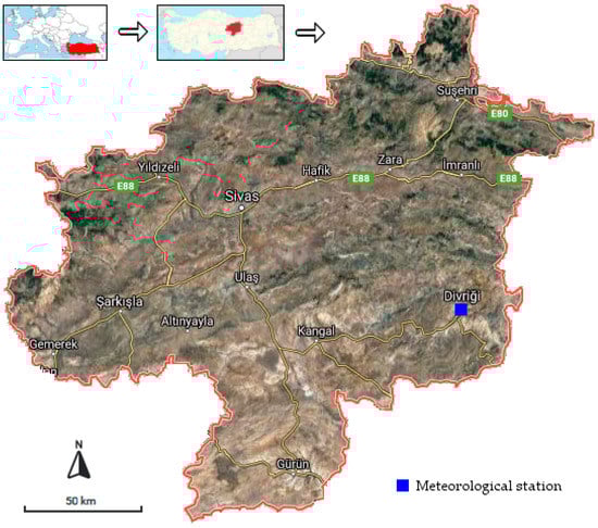 This study was carried out using values measured at the weather station located in Turkey’s Sivas Divrigi district (Figure 1). 27,202 km2 area of Sivas province of Turkey’s 2nd largest province is 66.5% of the active population in the agricultural sector. The province is an important vegetative production center offering a wide variety of agricultural products depending on the presence of a large agricultural land and microclimate agricultural basin. 41% of its land is suitable for agriculture, 27% is pasture, 13% is forest and shrubbery, and 19% is non-agricultural areas. According to the 2018 cultivation areas in Sivas, oats are the first, second is trefoil, third is wheat, sixth is alfalfa, seventh is sugar beet, and eighth is potato agriculture in the country [31,32].
