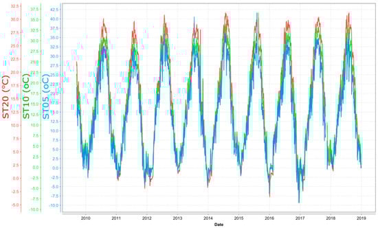 Basic statistics about the data used are given in Table 1. Soil temperature values at a depth of 5 cm vary greatly compared to soil temperature values of 10 cm and 20 cm. The daily change of the average soil temperature at different depths throughout the year is given in Figure 2. In a sense, the change between the minimum and maximum temperature values is high. The testing was performed using the 70–30 report between training and test data. Data were split chronologically. Initial data had 3395 records. It was used in two separate repositories: the first 70% in the Training Data repository, between September 2009 and March 2016, was used to train the model, while the next 30% part, from March 2016 until December 2018, in the Test Data repository was used for validating it. These two repositories were used in all the created processes. We evaluated the best method and scenario for each of the proposed algorithms in order to implement and run a process that covered all the decided scenarios.